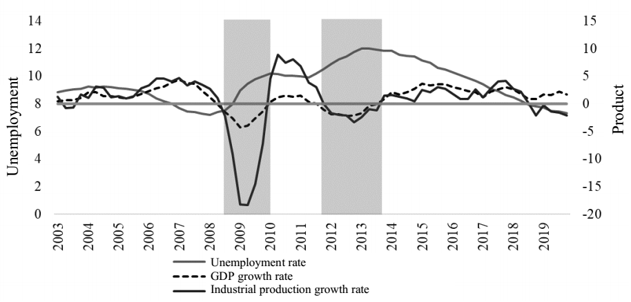 The Great Recession (GR) led to large fluctuations in production and employment levels in the eurozone. According to figures from the European Statistical Office (Eurostat), the unemployment rate across the region went from 7.6% in 2008 to 12% in 2013. Spain and Greece were the hardest hit, with rates of 26.1% and 27.5%, respectively. Therefore, the aftermath of the financial crisis conditioned economic policy in terms of objectives and instruments.