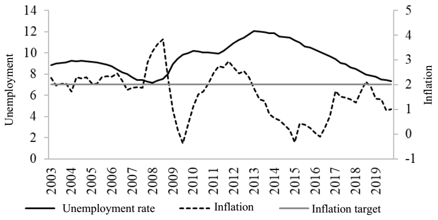 Figure 2 Unemployment and inflation; eurozone, 2003-2019