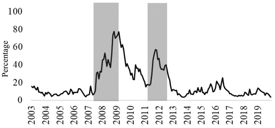 Through the composite indicator of systemic stress (CISS)2 presented in Figure 3, this study identifies the rise in systemic risk since months before the collapse of September 2008 and the subsequent tensions in sovereign debt segments that threatened the stability of the euro between 2011-2012. It is also possible to appreciate the moments of stability brought about by using the NCMP instruments, such as the decline in the index since mid-2009 with the first CBPP and the announcement of the OTM in August 2012.