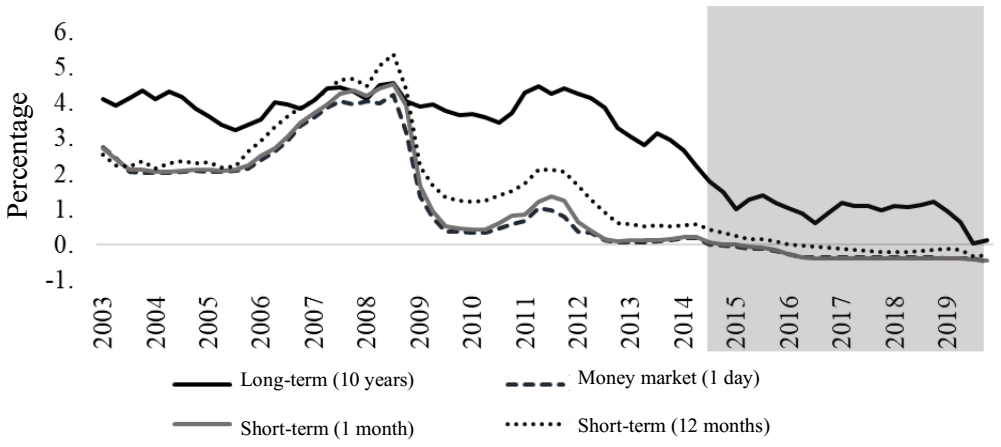 Note: the shaded part corresponds to the period with negative interest rates in the money market