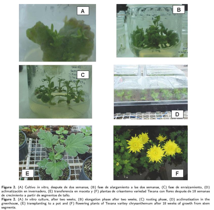 El desarrollo de plantas completas de crisantemo, desde los segmentos de tallo para Texana e Indianápolis hasta floración, requirió 119 y 126 días. Lu et al. (1990), registraron un período de 15 semanas para la variedad Royal Purple, quienes emplearon los segmentos de tallo para obtener plantas completas a través de regeneración directa. En comparación, un sistema de regeneración que utiliza como explante los meristemos, la obtención de plantas con flores es de 21 semanas según experiencia de los productores de crisantemo de la región de Texcoco. En invernadero, el tiempo que se requiere para obtener plantas con flores desde esquejes es de 15 semanas, de acuerdo al manejo de los mismos productores de crisantemo de la región.