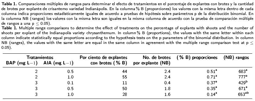 De las seis variedades de crisantemo evaluadas con 12 combinaciones hormonales, únicamente las variedades Indianápolis y Texana regeneraron en brotes adventicios, a partir de segmentos internodales de tallo. Ambas variedades, que si regeneraron, lo hicieron bajo diferentes combinaciones de BAP (2 mg L1 y 3 mg L1 ) y AIA (1 mg L1 y 1.8 mg L1).