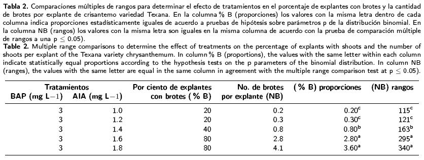 En cinco tratamientos se obtuvo respuesta. La mejor la combinación fue en 3 mg L1 de BAP y 1.8 mg L1 de AIA, bajo la cual se logró un 80% de explantes con brotes (Tabla 2). Al igual que la variedad Indianápolis fue necesaria una relación de BAP/AIA cercana a 2:1 para lograr la emisión de brotes. En la variedad Texana se hicieron dos subcultivos de dos semanas cada uno para inducir una mayor cantidad de brotes por explante (2.4 en Indianápolis contra 4.1 en Texana).