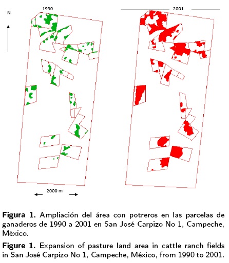 Las parcelas de los ejidatarios en San José Carpizo No. 1 miden 40 ha. Se componen generalmente de una superficie plana, donde se practica agricultura mecanizada, y una superficie en lomeríos de pendientes suaves. Los productores establecen los potreros en los lomeríos, ampliando paulatinamente su superficie a partir de los caminos rurales que bordean o atraviesan los lomeríos. La superficie ganadera en el ejido aumentó de 1990 a 2001 en 180 % (Figura 1).