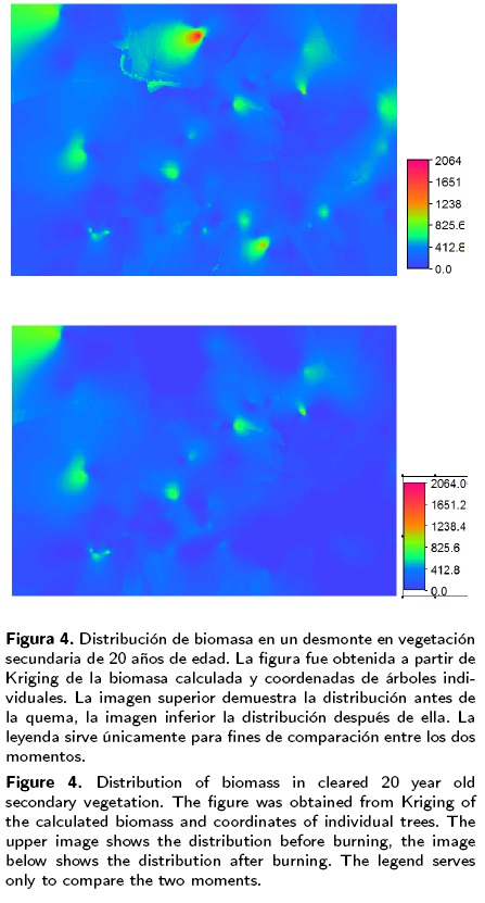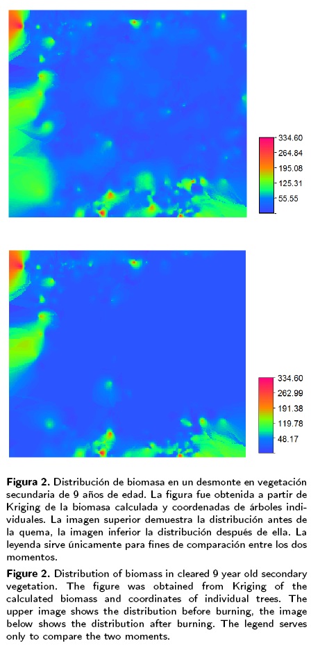 Se utilizó el procedimiento geo-estadístico Kriging, disponible en el programa de análisis geográfico ILWIS versión 3.3., para generar mapas de la distribución de biomasa antes y después de la quema de ambos desmontes. Se determinó la correlación entre los valores de los pixeles en ambos momentos. Para el cálculo de la biomasa se usó la fórmula Y = exp[ -2.173 + 0.868 ln (D2 *TH) + 0.0939/2] , donde Y es el peso seco total en kilogramos, D el DAP en cm, y TH la altura total en m. La formula fue propuesta para selvas medianas sub-perennifolias en la Península de Yucatán por Cairns et al. (1989) (Cairns MA, Olmsted I, Granados J y Argaez J 1989. Forest Ecology and Management 186: 125-132).
