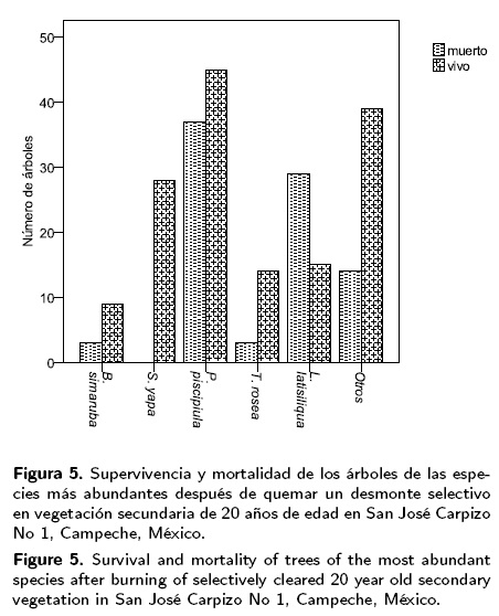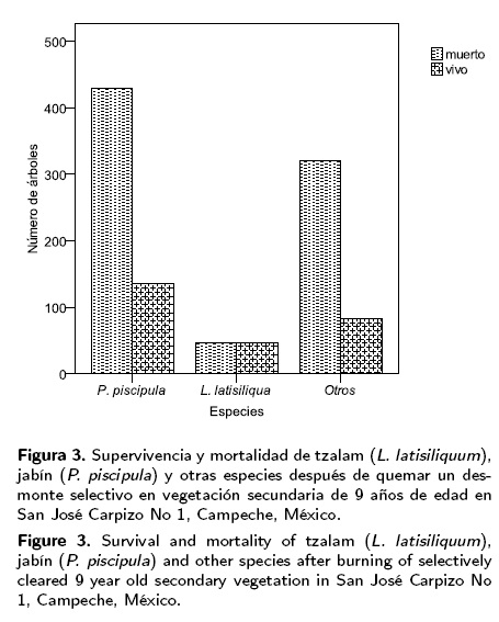 La supervivencia al fuego de los árboles dejados en pie fue de 67 %. La mayoría de los árboles sobrevivientes era de las especies jabín (P. piscipula), palma (S. yapa), tzalam (L. latisiliquum) y macuilis (T. rosea) (Figura 5). Hubo árboles sobrevivientes de en total 11 especies. Como en el desmonte en vegetación de 9 años de edad, el DAP promedio era mayor entre los árboles sobrevivientes que entre los muertos: 24.7 y 28.1 cm en jabín; 30.4 y 40.5 cm en tzalam. El porcentaje de supervivencia era mayor en jabín (P. piscipula) que en tzalam (L. latisiliquum). Lo anterior indica que a mayores DAP jabín tolera mejor el fuego que tzalam, posiblemente debido a que la corteza de tzalam se desprende fácilmente.