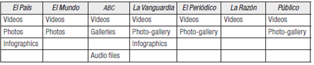 The textual format continues to dominate in digital dailies, though multimedia resources are increasingly relevant. The study shows that four of the six dailies under examination(El Mundo, ABC, El Periódico and La Razón) group such resources under the heading "Multimedia"; while the others provide direct access to said documents. As can be seen in Table 1, videos and photos are present in all of the dailies except La Razón, which means photographs provided do not have a tag to take the reader directly to them.