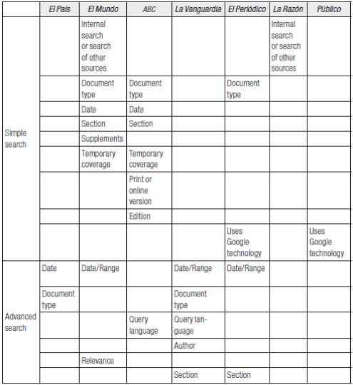 Except for La Razón and Público, all of the sample dailies offer both "simple" and "advanced" search options.3 In these two cases, only simple key word search capability is offered in a single text query field and no search filter options are provided. Searches of the daily La Razón can be executed within the daily itself and using an external navigator, offering access to documents from external sources. In contrast, Público uses Google navigation technology, but the results obtained consist of documents and resources created by the newspaper itself.