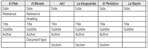 The table above shows La Razón and El Mundo at either end. Interestingly, ABC, La Vanguardia and El Periódico offer the user the same data on each document. The indicator "Sub-title" is employed by La Vanguardia, which generally refers to the beginning of the text body.