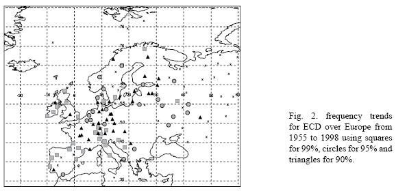The results obtained from the trends analysis of the synoptic patterns GWL occurrence, have shown significant negative trends (p < 0.10) in the five patterns previously mentioned; these results come in agreement with the decreasing of ECD: the increase of the minimum temperature average and the decreasing of the frequency of those synoptic patterns which generate cold waves, produce the decreasing of ECD over Europe.