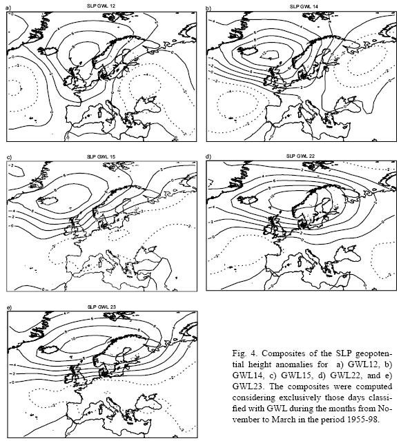Figure 4 shows maps of anomalies in sea level pressure (SLP) for the emphasized synoptic patterns and similar characteristics are observed among them (Fig. 4a to e). These characteristics are some types of weak anticyclone in the Atlantic Ocean and European north, successive losses in central and Western Europe, northerly winds, barometric marsh situations in the Mediterranean area (GWL14), and lows in Lithuania and Estonia which introduces cold air towards the center of Europe.