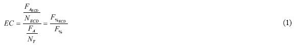 Using the relationship between the partial relative frequencies (F%ECD) and total relative frequency (F% ) of the synoptic patterns and the ECD that occurred during the period of study (NovemberMarch), a statistical coefficient was obtained to show the occurrence of a certain synoptic pattern GWL at a certain station. An effectiveness coefficient (EC) may be defined as: