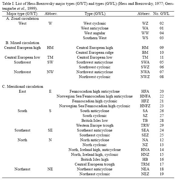 The Grosswetterlagen catalogue (Hess and Brezowsky, 1977; Gerstengarbe and Werner, 1993; Gerstengarbe et al., 1999) from 1901 to 1998, inclusive, was used to analyze the statistical relationships between the ECD and the atmospheric synoptic patterns. The classification recognises three groups of circulations types (zonal, halfmeridional and meridional), which are divided into ten major types (Grosswettertypen, GWT) and 29 subtypes (Grosswetterlagen, GWL; Table I).