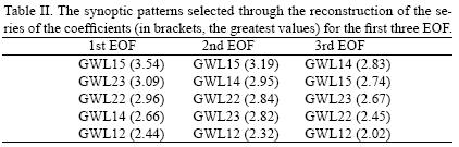 Table II shows the synoptic patterns through the reconstruction of the series of the coefficients for the first three EOF. It may be observed that patterns of GWL are equal in the three EOF, differing only in the value of the coefficient (in brackets). These five synoptic patterns are therefore the ones that contribute most to the occurrence of an ECD.