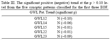 After the greater synoptic patterns that contribute to the occurrence of ECD had been identified, a trends analysis was carried out to verify the behavior of these situations, by taking into account the results obtained in the analysis of the annual frequency of ECD. The methodology used to calculate the trends analysis was the same as that applied in the analysis of trends of ECD. Table III shows the results of the trends analysis of the synoptic patterns with negative and significant values in all cases (p < 0.10). In our study, an average decrease in the absolute frequency of the synoptic situations that influence an ECD of 0.10/year was determined.