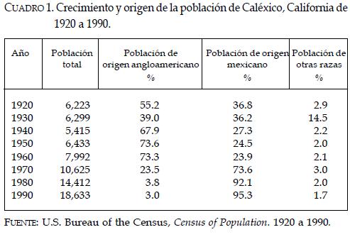 Históricamente la ciudad de Caléxico se ha caracterizado por contar con una población conformada por diferentes grupos de inmigrantes de varias nacionalidades. Desde sus inicios han predominado dos grupos de residentes: los angloamericanos y los de origen mexicano (ver cuadro 1). Los datos censales de la población de la ciudad permiten observar que desde los años veinte 2 y hasta 1960 los angloamericanos conformaban la mayoría de la población, seguidos por el grupo de mexicanos. Sin embargo, a partir de ese año la composición de la población se invirtió, de manera que el grupo que ha predominado durante los últimos 30 años es el de origen mexicano, mismo que le ha dado a la ciudad un toque atípico, al convertirla en la ciudad fronteriza del suroeste de Estados Unidos con mayor peso relativo de población de origen mexicano (U.S. Bureau of the Census, Census of Population, 1990).