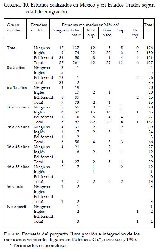 Al observar el cuadro 10 desde el punto de vista de los estudios realizados en el país de destino, destaca, en primer lugar, el peso de los migrantes que no han cursado estudios en Estados Unidos (176 de 407 o el 43.2%), seguido por el grupo de los que sólo estudiaron inglés (31.9%). Por otro lado, al revisar los grupos de edad, destaca el peso de los que emigraron en edad escolar (a una edad menor o igual a 25 años) en el total de los migrantes que cursaron educación formal (98 de 101 o el 97%), pero también concentran a más de la mitad (94 de los 176 o el 53.4%) de los migrantes que no realizaron estudio alguno en Estados Unidos.