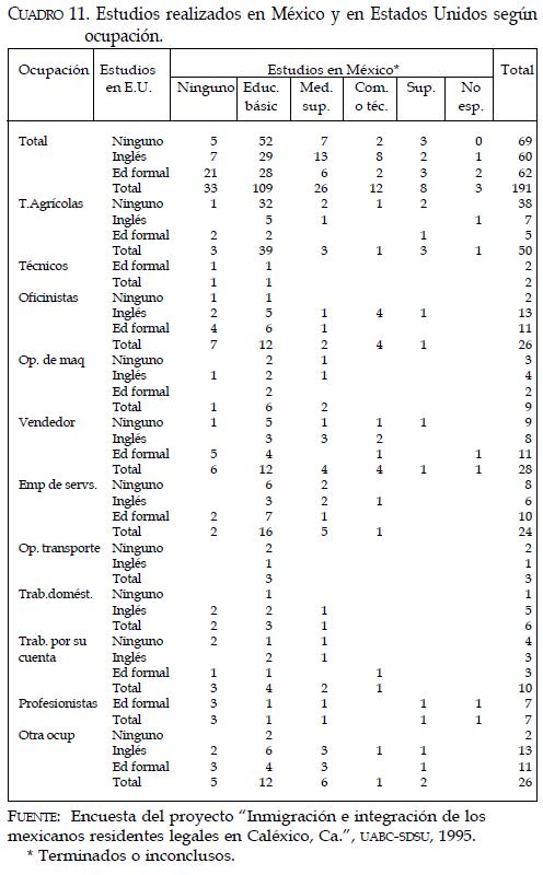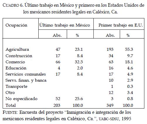 Esto sugiere una diferenciación de los mexicanos en relación con la ocupación en el país de destino, ya que si bien su primer fuente de trabajo en Estados Unidos es principalmente agrícola, una vez asentados allí, y adquirido cierto conocimiento del idioma, la estructura ocupacional cambia y se terciariza, sólo permanecen en las actividades agrícolas quienes tienen un pobre dominio del inglés o quienes no logran cursar estudios más allá del nivel básico. Las vacantes generadas por este cambio en el sector de actividad son cubiertas por otro grupo de mexicanos con permiso para residir y/o trabajar en Estados Unidos, pero quienes han optado por continuar como residentes permanentes del lado mexicano de la frontera.
