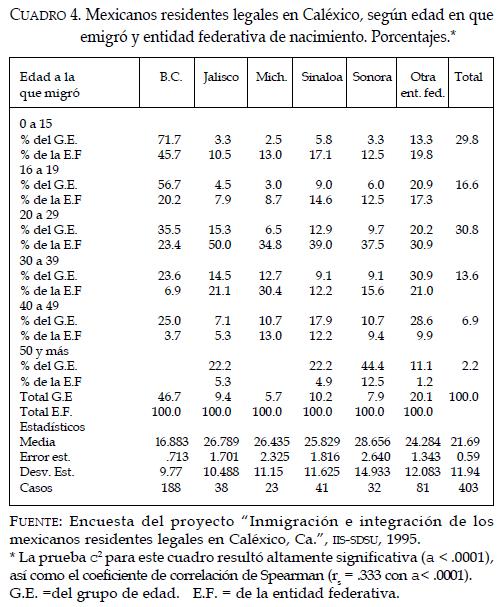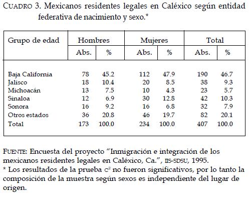 Este trabajo se planteó como propósito el describir a un grupo de mexicanos residentes legales en una ciudad fronteriza de Estados Unidos: Caléxico, Ca., así como su inserción y movilidad laboral. Como resultado una característica a destacar de este grupo es que los inmigrantes mexicanos proceden mayoritariamente de cinco entidades federativas mexicanas ubicadas en la costa del Pacífico que forman parte de una corriente migratoria que parte del estado de Michoacán hacia el norte, de las cuales Baja California aporta casi la mitad de ellos. Por otro lado, también sobresale el hecho de que los nacidos en Baja California registran un promedio de edad al momento de emigrar significativamente menor a las medias registradas por los nativos de las demás entidades mexicanas. Estas dos particularidades de los nacidos en Baja California entre los mexicanos residentes en Caléxico elevado peso relativo en el conjunto y menor edad al momento de emigrar se pueden deber a que la cercanía con Estados Unidos les permite, por un lado, tener mayor acceso a la información de la sociedad receptora (incluso contacto) y a los trámites de inmigración y, por el otro, al funcionamiento ágil, por la proximidad, de las redes familiares que representan una vía para tramitar la residencia legal en ese país; mientras que los inmigrantes provenientes de otras entidades tienen que enfrentarse al problema de la distancia, que implica mayores tiempos en el envío de documentos y gastos de traslado, primero para llegar a la frontera mexicana y posteriormente para entrar a Estados Unidos.