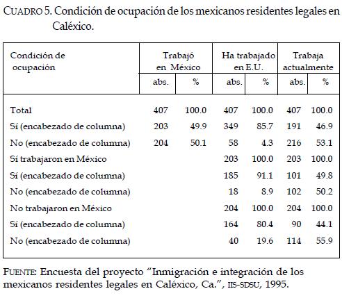 En cuanto a la condición de ocupación de los inmigrantes mexicanos residentes legales en Caléxico, del total de las personas entrevistadas, la mitad no había realizado un trabajo previo en México (ver cuadro 5); sin embargo, este porcentaje está afectado, en buena medida, por el hecho de que casi el 30% de los migrantes no tenía edad para trabajar cuando salió de su país (ver cuadro 4).