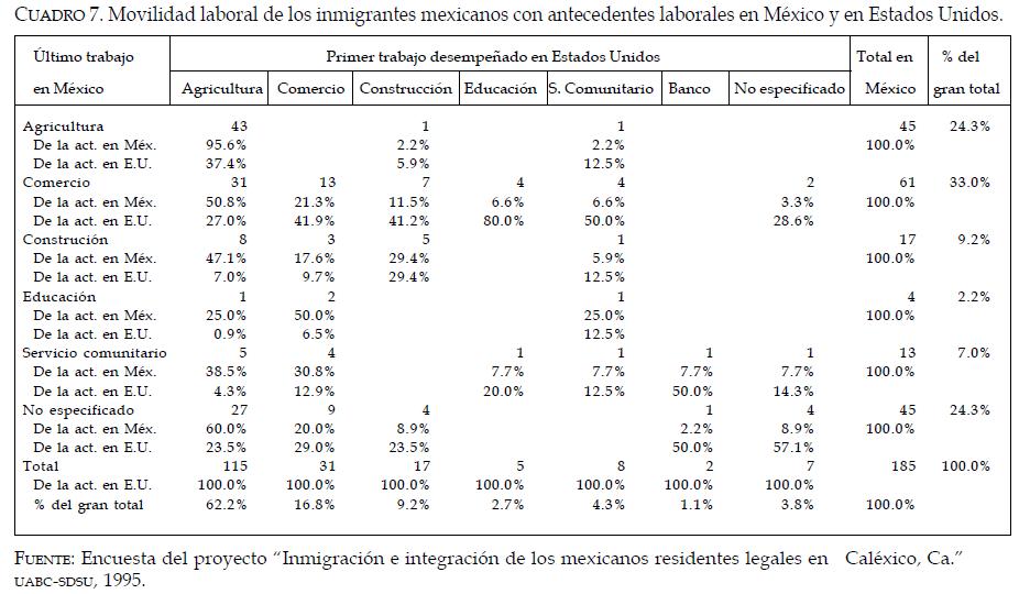 En el cuadro 5 se observa que del total de la muestra, sólo 185 inmigrantes contaban con antecedentes laborales en ambos países, y es este grupo el que sirve como indicador para observar la movilidad laboral desde una perspectiva sectorial e internacional. En este sentido, un primer aspecto a destacar en el cuadro 7 es la confirmación de la importancia de la agricultura como primer fuente de trabajo de los inmigrantes mexicanos, ya que 6.2 de cada 10 personas con antecedentes laborales en México tuvieron su primer empleo en las actividades agrícolas, dicho en otros términos, por cada inmigrante dedicado a la agricultura en México, en Caléxico lo hicieron 2.6.