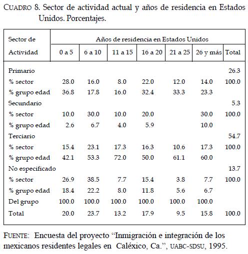El cuadro 8 fue elaborado bajo el supuesto de que los inmigrantes, conforme aumentaran su tiempo de residencia en el lugar de destino, acumularían experiencia y mayor especialización en su trabajo, lo que se traduciría en cambios en el sector de ocupación, esto es, del sector primario al secundario o terciario los cuales, en general, presentan mejores condiciones laborales, tanto porque son trabajos menos extenuantes que el agrícola como porque no se llevan a cabo a la intemperie, a la par que las vacantes por ellos generadas fueran cubiertas por los recién inmigrados; sin embargo, la información recopilada no permitió establecer una dependencia estadísticamente significativa entre sector de actividad y los años de residencia en Caléxico, a pesar de que los mexicanos residentes legales se ocupan mayoritariamente en actividades terciarias en una proporción superior al doble de las primarias.