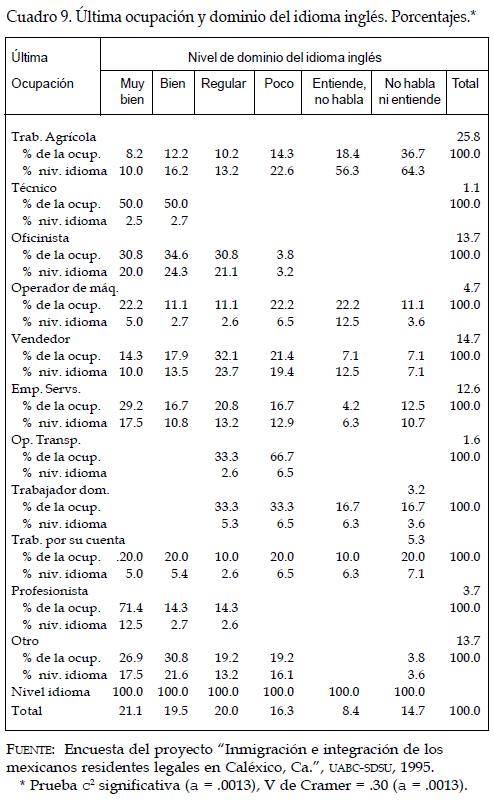 En general, la información del cuadro 9 indica proporciones de alrededor del 20% en cada una de las tres clasificaciones más altas del dominio del inglés, es decir, 6 de cada 10 inmigrantes mexicanos hablan inglés entre regular y muy bien, el resto se distribuye de manera desigual entre las clasificaciones más bajas. Así, el 16.3% de los trabajadores habla poco inglés, el 14.7% no habla ni entiende el idioma y el 8.4% restante sólo lo entiende. Esto significa que casi una cuarta parte de los trabajadores (23.1%) no habla inglés.