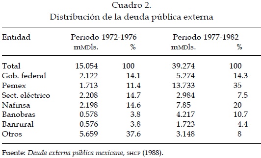 En el cuadro 2 se presenta la distribución de recursos en el sector público para los subperiodos 1972-1976 y 1977-1982. Destaca que durante el primer subperiodo, el gobierno federal, Pemex, el sector eléctrico y Nafinsa obtuvieron las mayores proporciones de recursos. De 1977 a 1982, sin embargo, Banobras sobrepasó al sector eléctrico en la proporción de recursos recibidos. Asimismo, notamos que en este último periodo el sector petrolero fue el más beneficiado, dato no sorprendente si consideramos que para entonces México se convirtió en el cuarto país productor de petróleo a nivel mundial. La utilización de los recursos en Pemex se reflejó en la conclusión de La Cangrejera, el complejo petroquímico más grande del mundo.