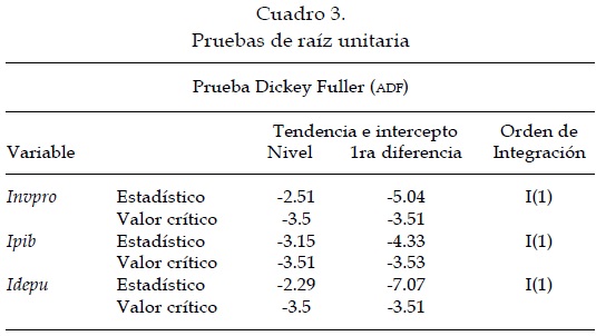 En este ejercicio nos interesa evaluar la relación que mantienen las variables descritas anteriormente en el corto y en el largo plazos. Para tal propósito la metodología apropiada se refiere a la teoría de la cointegración. Como es ampliamente conocido, para instrumentar dicho análisis es necesario que las series sean no estacionarias e integradas de orden uno, I (1). Para verificar esta propiedad se efectuó la prueba de raíz unitaria sugerida por Dickey y Fuller (1979) en su forma aumentada (ADF). La misma considera la hipótesis nula de no estacionariedad de la serie contra la alternativa de estacionariedad. Los resultados se resumen en el cuadro 3. Nótese que en todos los casos la hipótesis nula no se rechaza en niveles pero sí en primeras diferencias, lo cual indica que las series se encuentran integradas de orden 1.
