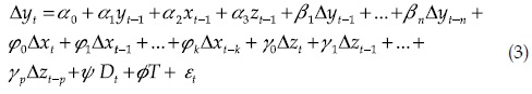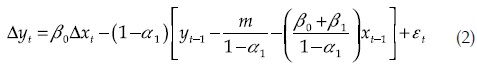 donde α1 es la velocidad de ajuste, α2 y α3 representan las elasticidades de largo plazo, las β's suman la dinámica de corto plazo, Dt es un vector de variables determinísticas y T es una tendencia. La cointegración se cumple si el coeficiente de ajuste resulta negativo, estadísticamente significativo y menor a 1 en términos absolutos.