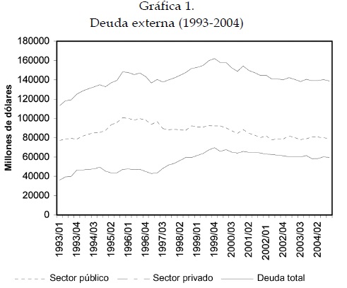 La práctica de financiarse con recursos externos, sin embargo, cambió a partir de mediados de los ochenta. El país entró en un periodo de desestabilización económica que obligó al sector público a disciplinar su gasto, y en consecuencia los préstamos provenientes del exterior disminuyeron. Como se muestra en la gráfica 1, la deuda pública externa presenta una tendencia no creciente en los últimos años.