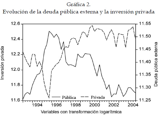 En la gráfica 2 se muestra la relación entre la tasa de crecimiento de la deuda pública externa y la inversión privada para el periodo 1993-2004.