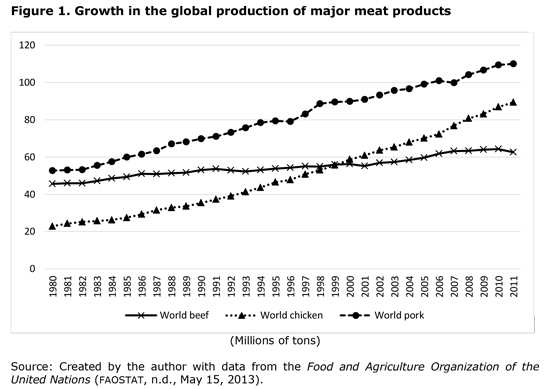 In recent years, global meat production has increased at a moderate pace due to changes in people's diets in favor of healthier diets based on chicken meat. In 1980 and 2011, the global share of beef was 33.3% and that of chicken and pork was 21%, with a production of 45.6 million tons and 62.5 million tons, respectively. Figure 1 shows the evolution of the three main meat products.
