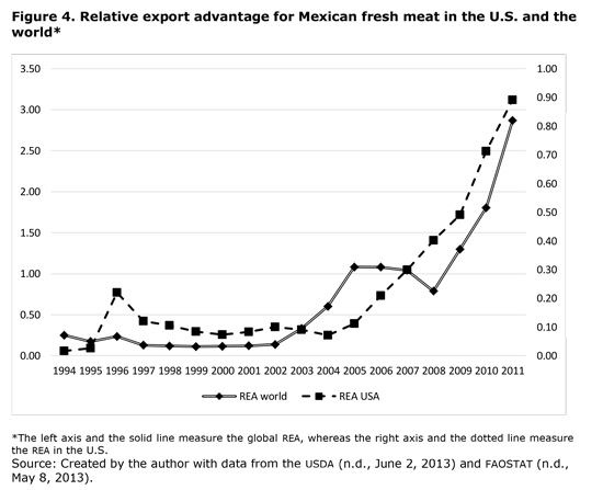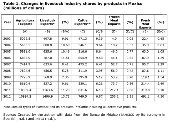 A distinct finding in the current process of Mexican livestock industry is that its share in the agricultural sector has increased from 9.91% in 2003 to 13.72% in 2012. The changes in the livestock share of fresh and frozen meat are examples of the elevated production dynamics and the generation of greater value, at the expense of exports of live cattle shares. Escalante and Catalán (2008), Carrera and Bustamante (2013) and Omaña et al. (2014) present evidence on the growth and progressive dynamics of the sector using productivity indicators, the REA, and the increasing global market share, which are a reflection of their competitiveness.