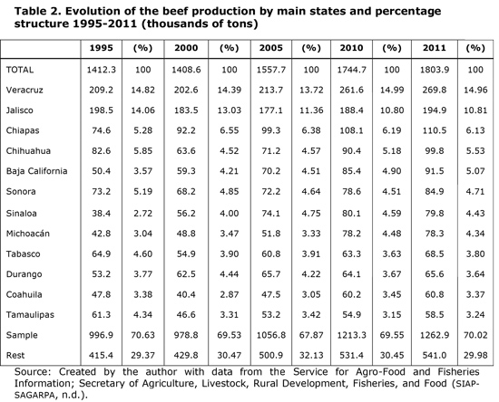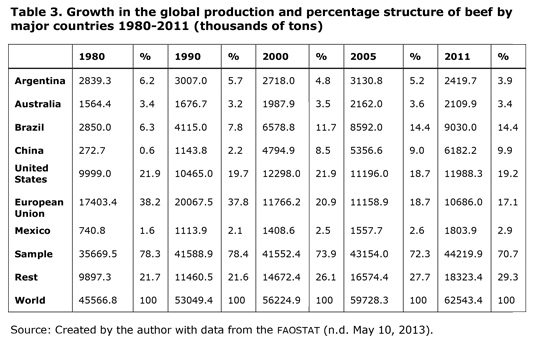 Although the global beef market share has declined, the market remains dynamic. In some regions of the world, such as the U.S., consumption has increased, and the shares of other countries have changed. European shares were 30% of the global production in 1980; however, this number decreased to 17% in 2011. The reduction in European shares was conceded to Brazil and China, which account for 24.3% of the beef production. Mexico has experienced slow but steady growth, from 1.63% in 1980 to 2.88% in 2011, which indicates a relative increase in productivity. Table 3 shows the shares of major beef-producing countries.