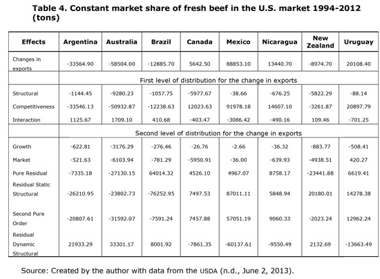 Table 4 lists the major exporters of beef to the U.S. From 1994-2012, Canada, Mexico, Nicaragua, and Uruguay exhibited positive results in terms of market share, whereas Argentina, Australia, Brazil and New Zealand showed negative results. Table 4 and Figure 4 confirm that Argentina and Australia's stake has gradually decreased since the beginning of the period. Argentina decreased from 4.4% in 1994 with 34,105.5 tons to less than 1.5% in 2012 with 10,265.5 tons. Australia decreased its share by 35.9% to 21.9% within the same period. Mexico and Uruguay gained market shares, with 12.08% and 3.05%, respectively. The main increase in market share was due to competitiveness based on the residual static structural effect and the pure second-order effect. In the Argentine and Australian cases, the loss of shares was an effect of competitiveness. In all cases, the changes in market share were primarily attributed to competition in the U.S. market instead of total competitiveness.
