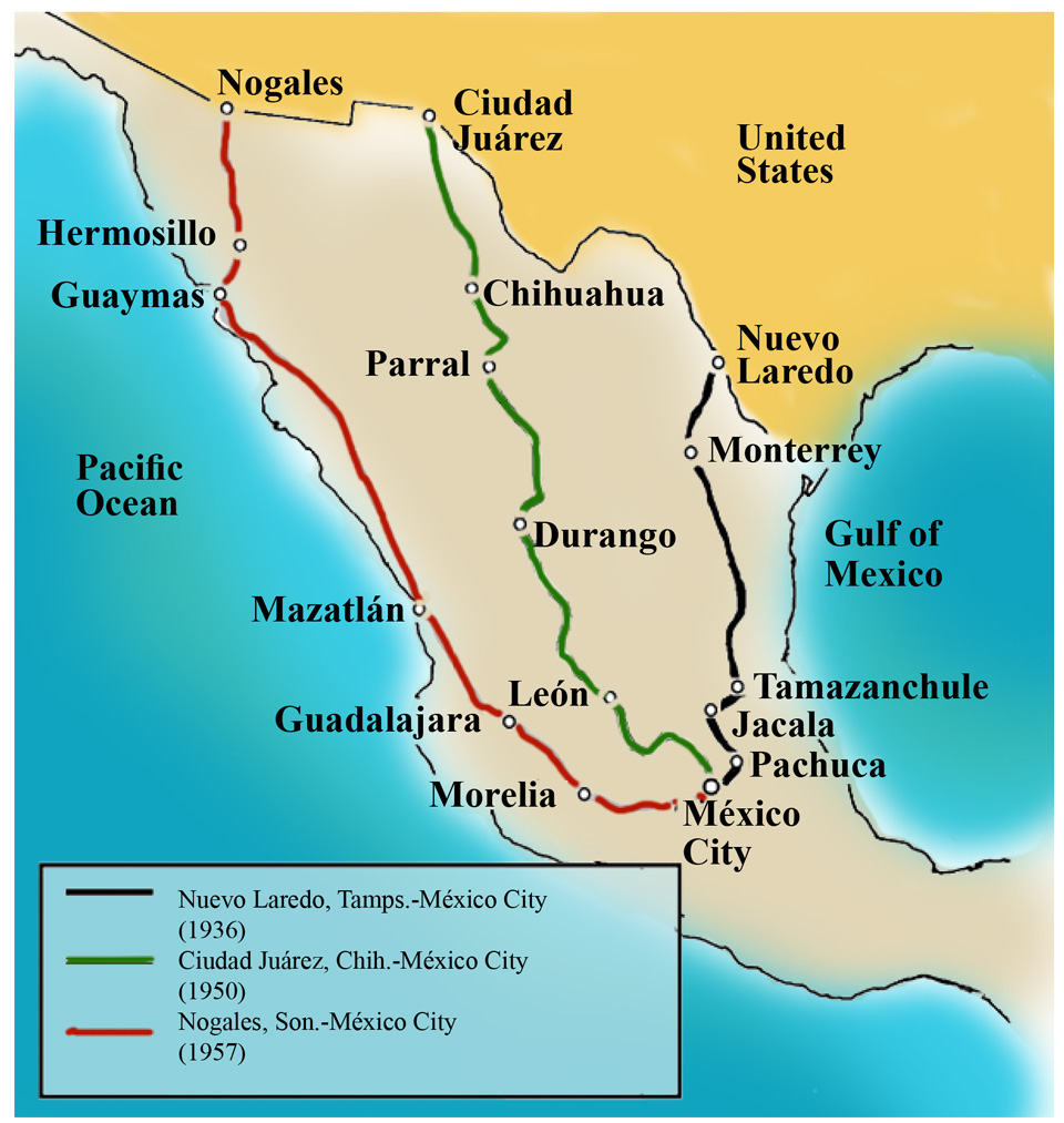 On July 1st, 1936, the diplomatic encounter between Mexico and the United States on the Laredo International Bridge, Texas and Nuevo Laredo, Tamaulipas, inaugurated the first portion of what would be later called the “Pan American Highway”. The inaugural event officially started the circulation of cars from Rio Grande to the Mexican capital. The reception of the event, described as a “very well-known occasion” (García, 2015, p. 414), transcended to Washington and other American geographic locations, finalizing ten years of work and investments of 65 million pesos-equal to 17 million dollars at that time-(Merril, 2009, p. 70; National Revolutionary Party [Partido Nacional Revolucionario-PNR, for its acronym in Spanish], 1936). As illustrated in Figure 1, although the construction of highways continued for a good portion of the twentieth century, the opening of this path facilitated the integration between the northern border of Mexico and central Mexico.