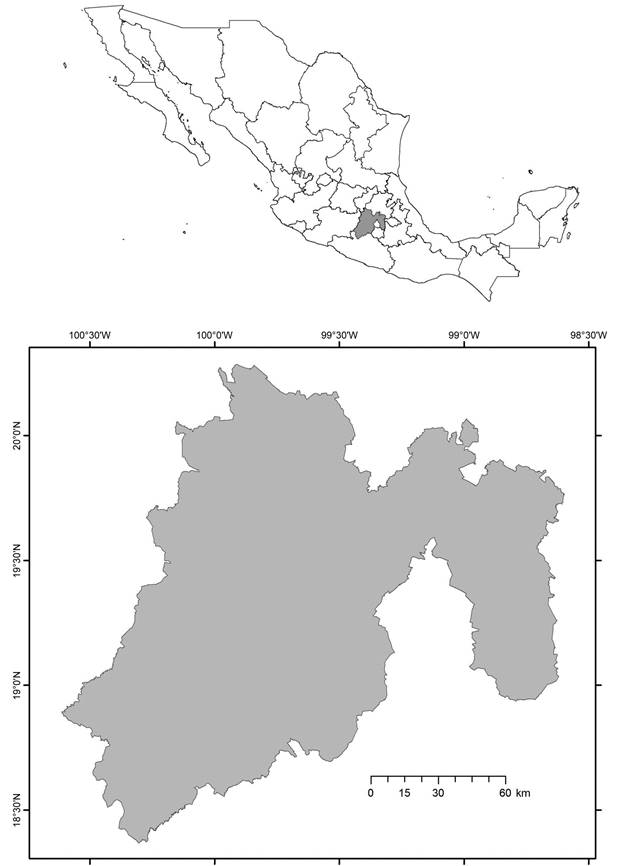 Está constituido por 125 municipios, de los cuales 59 integran la Zona Metropolitana del Valle Cuautitlán-Texcoco, 16 el Valle de Toluca y seis la Zona Metropolitana de Santiago Tianguistenco. Colinda con los siguientes estados: Hidalgo y Querétaro, al norte; Ciudad de México, Puebla y Tlaxcala, al este; Guerrero y Morelos, al sur; y Michoacán, al oeste (Fig. 1) (POEM, 2009, 2016; INEGI, 2016a).