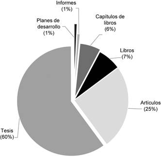 Finalmente, la lista de angiospermas se integró por 169 familias, 1103 géneros y 3924 especies (Apéndice 4, Cuadro 2), de las cuales 3657 angiospermas están reportadas en la literatura florística-taxonómica para el estado y otras 267 especies están citadas en la bibliografía no estrictamente enfocada a la entidad mexiquense, es decir, documentos estatales, regionales o incluso nacionales: artículos (30), capítulos de libros (2), informes de proyectos (2), libros (11) y tesis (3), además de la Flora Fanerogámica del Valle de México, Flora del Bajío y de regiones adyacentes (143 fascículos) y Flora de Guerrero (31). Los artículos y las tesis destacan por el número de contribuciones (Fig. 2), los primeros concentran el mayor número de angiospermas exclusivas (220), es decir, especies únicamente citadas en este tipo de bibliografía, y las tesis registran 80% de los taxa presentes en la entidad (3117 especies) (Cuadro 3).