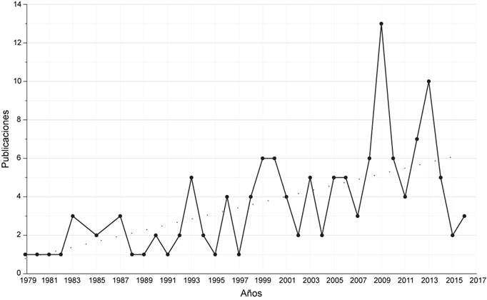 La consulta de literatura florística elaborada en el territorio del Estado de México mostró que se han llevado a cabo al menos 128 trabajos en el transcurso de 38 años, lo que refleja una tendencia de incremento a través del tiempo (Fig. 3). En promedio, se registraron 3.3 inventarios por año.