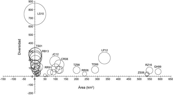 Para comparar la riqueza de especies en áreas de diferentes tamaños, se empleó el índice de biodiversidad taxonómica (Squeo et al., 1998), el cual considera el número de especies, dividido por el logaritmo natural del área en kilómetros cuadrados.