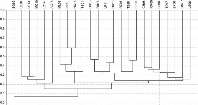 Figura 8: Similitudes florísticas entre los inventarios llevados a cabo en el Estado de México. Coeficiente de similitud utilizado: Sørensen-Dice; método de agrupamiento: UPGMA. GM87: González-Martínez y Rodríguez-Zaragoza (1987), FR90: Fragoso-Ramírez (1990), P92: Pulido y Koch (1992), TZ98: Torres-Zúñiga y Tejero (1998), ZG99: Zepeda-Gómez y Velázquez-Montes (1999), RM00: Rivas-Manzano y Vibrans (2000), TS01: Torres-Soria (2001), SG04: Sánchez-González (2004), ML06: Medina-Lemus y Tejero-Díez (2006), CR08: Castañeda-Robles (2008), LS08: López-Sandoval et al. (2008), ZP08: Zepeda-Peña (2008), LS10: López-Sandoval et al. (2010), MC10: Martínez-De La Cruz (2010), LP11: López-Pérez et al. (2011), DH13: Dorantes-Hernández y Piña-Dorantes (2013), OK13: Ochoa-Kato (2013), RB13: Rodríguez-Barquet y Rodríguez-Sánchez (2013), LC14: Luna-Céspedes (2014), LZ14: López-Zamora (2014), AG16: Aguilera-Gómez et al. (2016), HC16: Hernández-Cruz et al. (2016), RZ16: Rojas-Zenteno et al. (2016) y TD17: Trejo-Díaz y Tejero-Díez (2017).