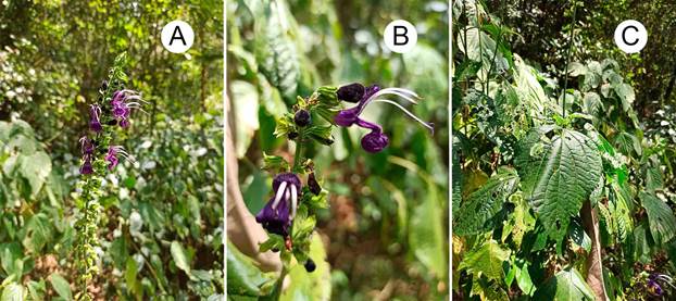 Figura 4: Algunas especies de Salvia sección Siphonantha Epling. A. Salvia lobbii Epling (Ecuador, I. Fragoso-Martínez 799 (QCNE)); B. Salvia pichinchensis Benth. (Ecuador, I. Fragoso-Martínez 634 (QCNE)); C. Salvia sigchosica Fern. Alonso (Ecuador, I. Fragoso-Martínez 732 (QCNE)). Fotografías de G. A. Salazar.