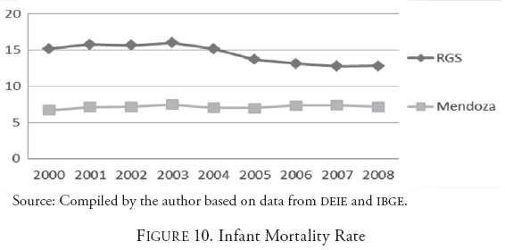 The infant mortality rate has shown a downward trend in both regions during the past decade (Figure 10). In the case of Mendoza, this trend has shown some fluctuations. In RGS, this social indicator has improved considerably in recent years.