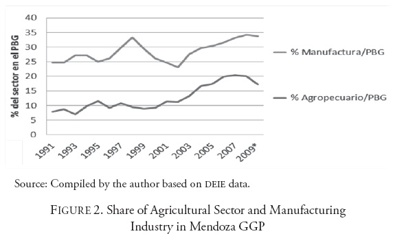 In the province of Mendoza, the relative share of the manufacturing industry is an average of 15 percent higher than the share of the agricultural sector of the GGP (Figure 2). According to Alderete and Bacic (2012a), the wine producing sector -Agricultural (Grape) plus Industrial (Wine and Must)- accounts for 18 percent of the total GGP.