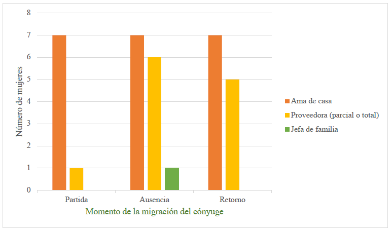 Como se puede observar, el rol que todas las mujeres desempeñan antes, durante y después de la migración de su cónyuge es el que corresponde al tradicionalmente denominado “ama de casa”. El rol de proveedora hace referencia a las ocasiones en las que gracias a sus negocios o al trabajo extra doméstico, se hacen cargo total o parcialmente de los gastos del hogar. Mientras que el rol de jefa de familia se refiere a la responsabilidad de proveer y de ejercer autoridad sobre los hijos e hijas y el cuidado de los mismos.