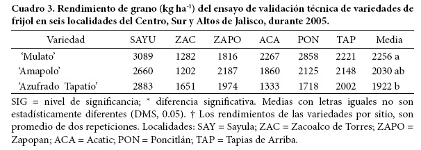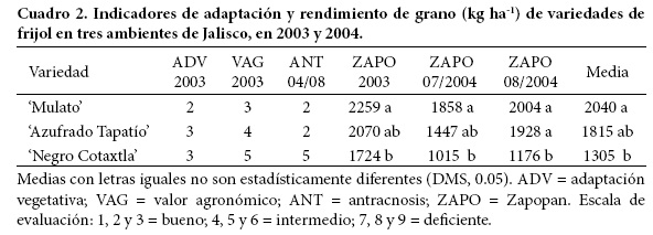 Por su parte, la línea NAB 69 de tipo 'Negro Jamapa' (Figura 2), proveniente del vivero internacional de progenitores donantes de genes (VIPADOGEN) del Centro Internacional de Agricultura Tropical (CIAT), resultó resistente a antracnosis y de hábito indeterminado erecto, y superior en rendimiento de grano a la variedad testigo 'Negro Cotaxtla' (Cuadro 2). Tanto en los viveros de evaluación como en las pruebas de validación, esta línea resultó superior a ambos testigos (Cuadro 3). Este tipo de frijol tiene demanda en Jalisco por las empresas empacadoras de granos. En marzo de 2009 se inscribió oficialmente en el CNVV del SNICS con el nombre de 'Mulato', con el registro FRI-055-240209.