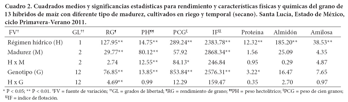 Se encontraron diferencias significativas (P ≤ 0.01) entre regímenes hídricos (H) para rendimiento de grano y las propiedades físicas y químicas del grano; entre tipos de madurez (M) para rendimiento de grano (RG), PH e IF (P ≤ 0.01); entre genotipos (G) para rendimiento de grano, PH, PCG, IF y contenido de proteína (P ≤ 0.05); mientras que la interacción H x M tuvo efecto significativo (P ≤ 0.05) en PH y PCG, y la interacción H x G solo en RG (P ≤ 0.01) (Cuadro 2).