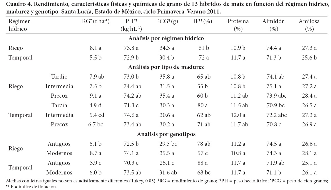 Boyer y Westgate (2004) postularon que en los híbridos sembrados bajo condiciones de temporal la deficiencia de agua inhibe sustancialmente la fotosíntesis que resulta en una escasa acumulación de materia seca. Esto se vio reflejado aquí en el contenido de almidón que fue mayor en los híbridos de riego que en los de temporal (Cuadro 4). Por otro lado, una mayor acumulación de almidón produjo granos con un PH alto, un mayor tamaño de grano y granos más duros. Yang et al. (2000) encontraron que en ambientes con alta humedad el PH es bajo, y en los de baja precipitación el PH es relativamente alto, pero tal comportamiento no se observó en este experimento.