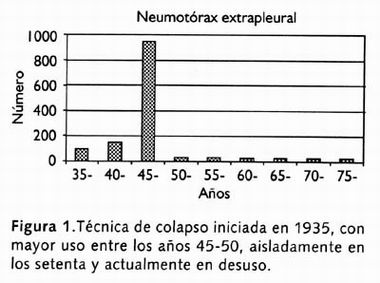 En 1935 se realizaron las primeras cirugías de neumotórax extrapleural (Figura 1) que aumentaron en forma considerable por la eficacia del procedimiento, pero, además, también por la carencia de otros recursos en los años 40-45. Esta técnica, como se observa en dicha figura, aún se realizó aisladamente en la década de los setenta. Actualmente es una técnica en desuso. En su momento, empero, fue un instrumento valioso cuando no se disponía de otros recursos quirúrgicos.